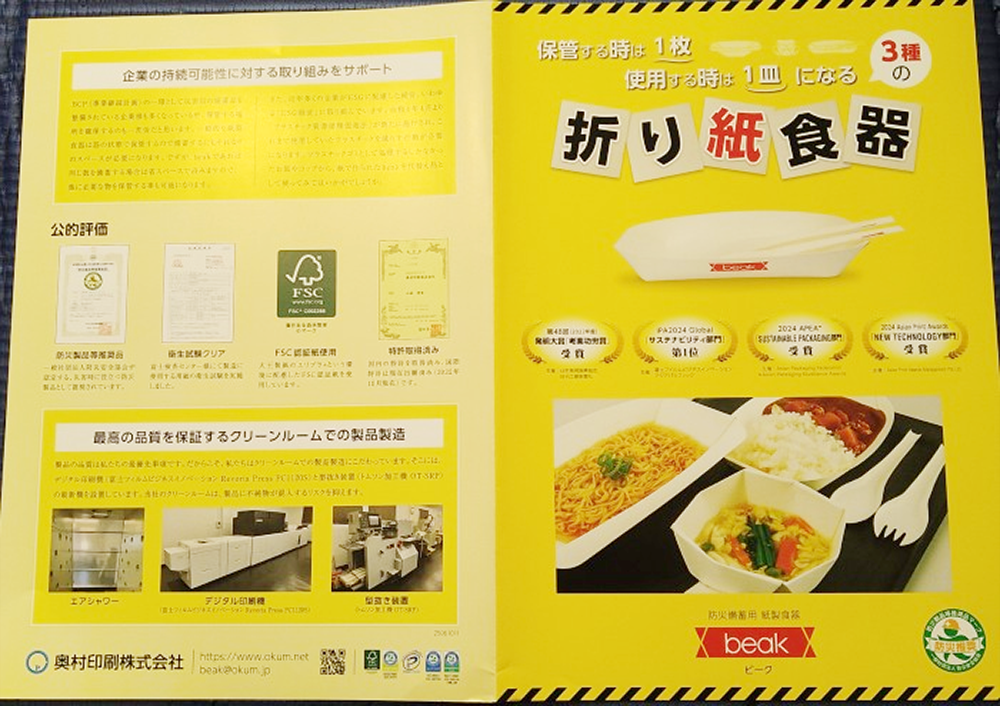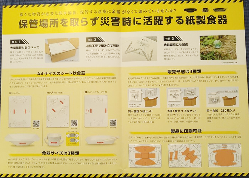 丼、カップ、皿+スプーン・フォークの3点セットで保管時はA4サイズで厚さは2mmくらい。嵩ばらないのがいいですね。