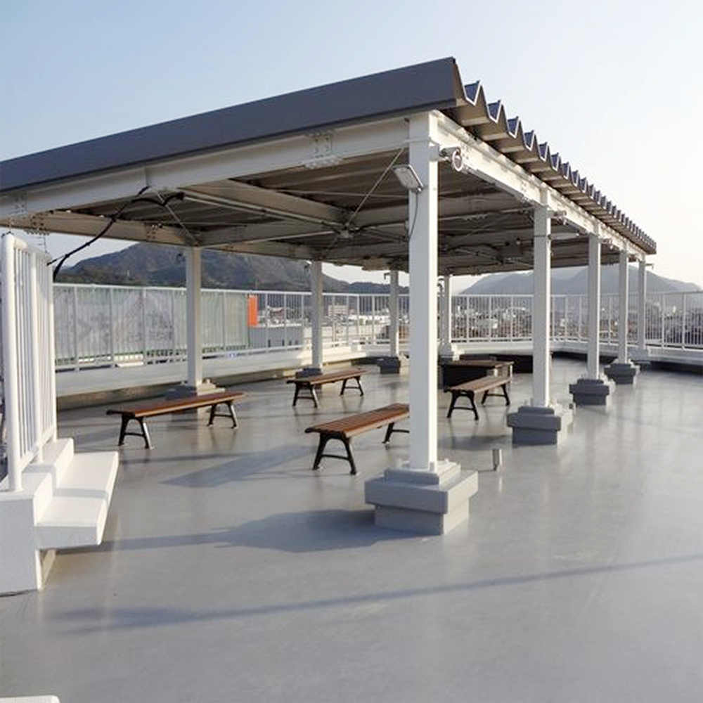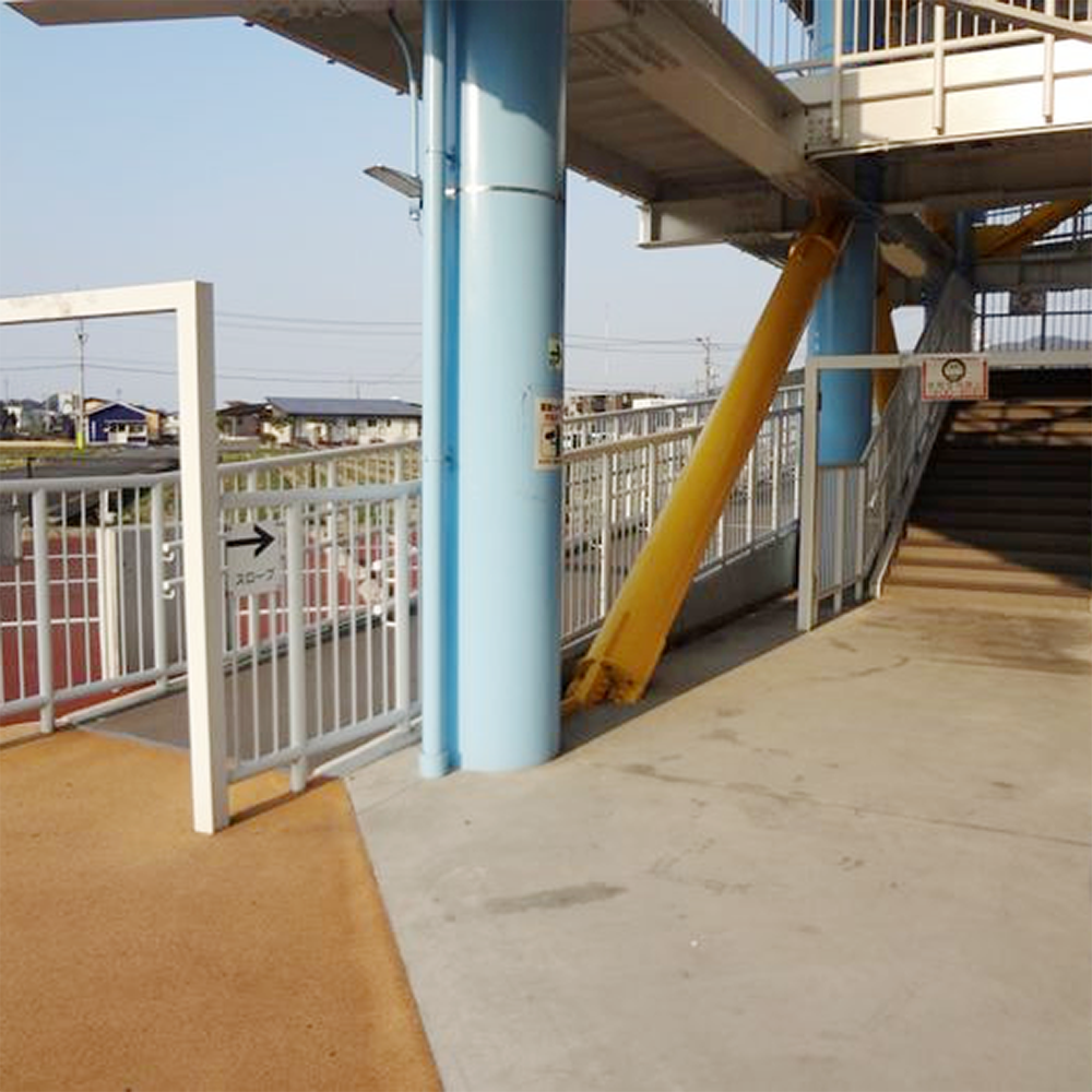 登り口は階段とスロープが並列にあり、スロープは1層目まで、階段は上層まで繋がっています。