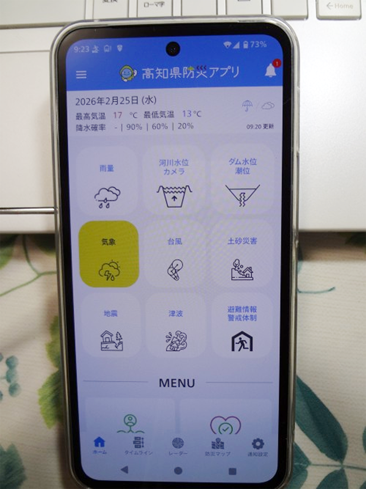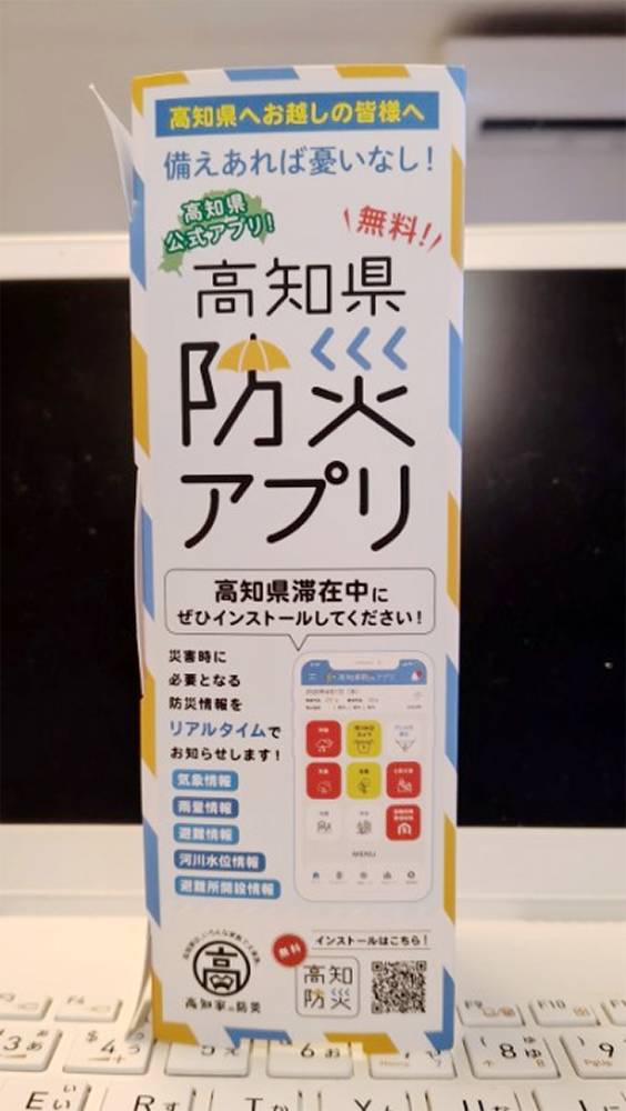 ホテルに入ると机の上に「高知県防災アプリ」の案内が。