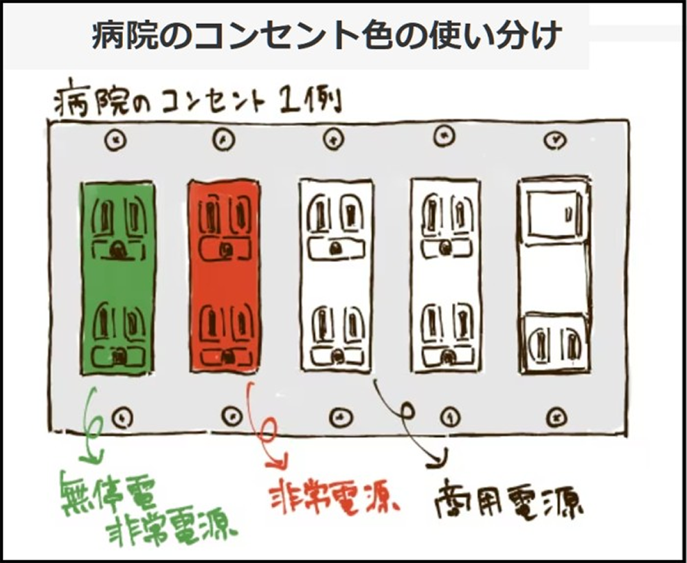 赤コンセントはニシム電子工業(株)のHP↓によれば、停電時に自家発電機が起動して40秒以内に電源復旧するラインだそうです。そういえば亡父が最後に入院していた病室にもあったような。。。。