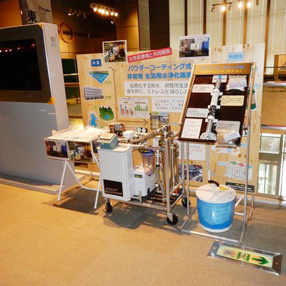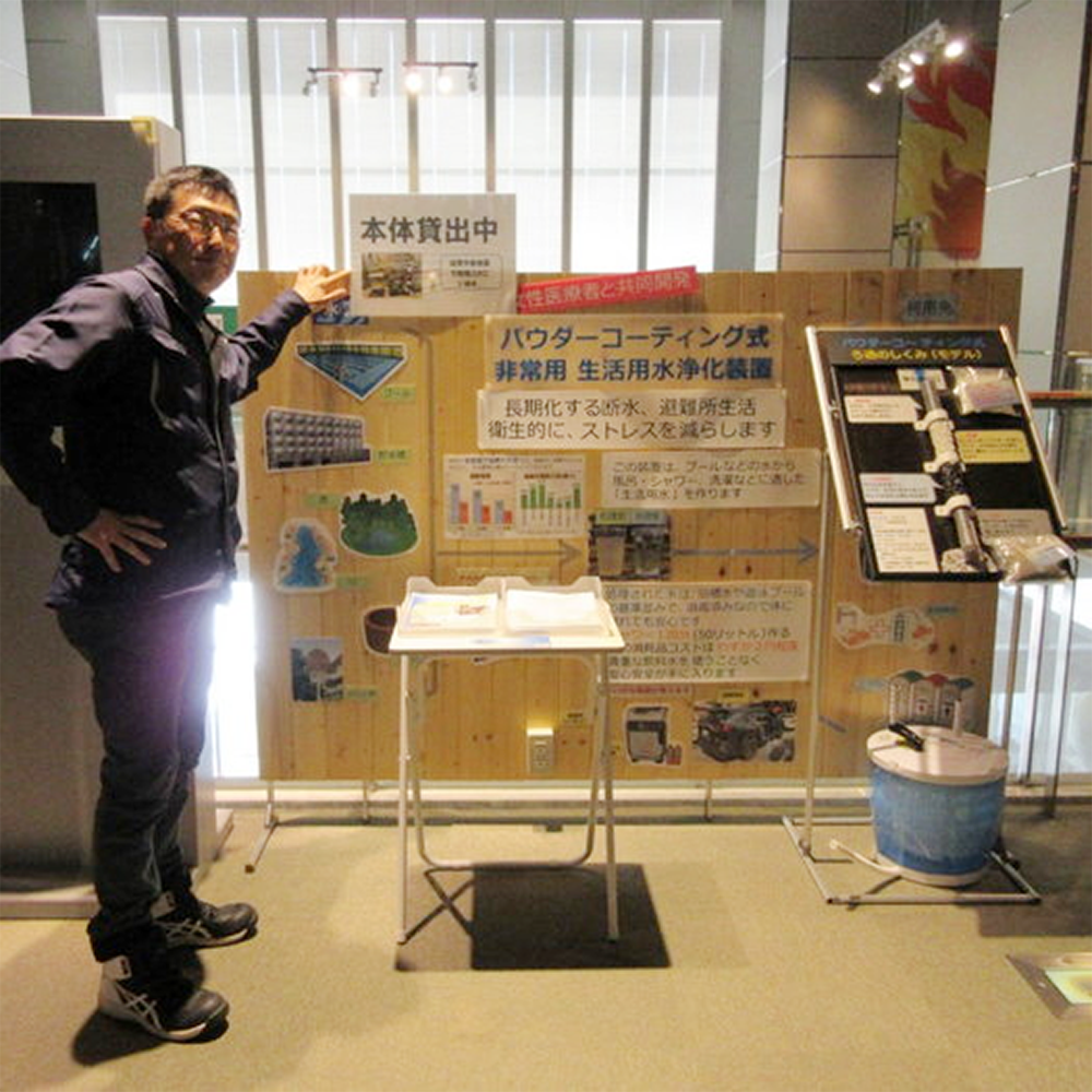 能登半島地震前は、被災時の生活用水には世間の関心は高くなかったですが、関連各所の皆様にご理解をいただき「個人の手作り品を県立の施設に展示、それもエレベーター出た正面に!」でした。